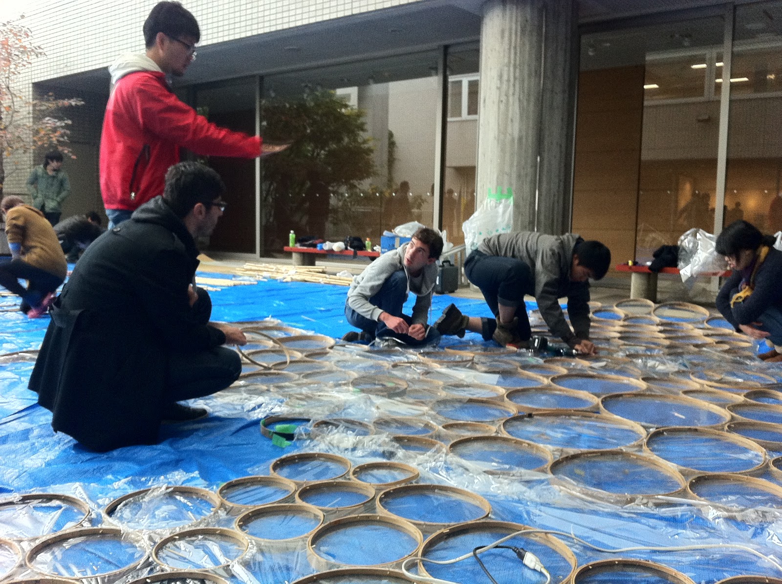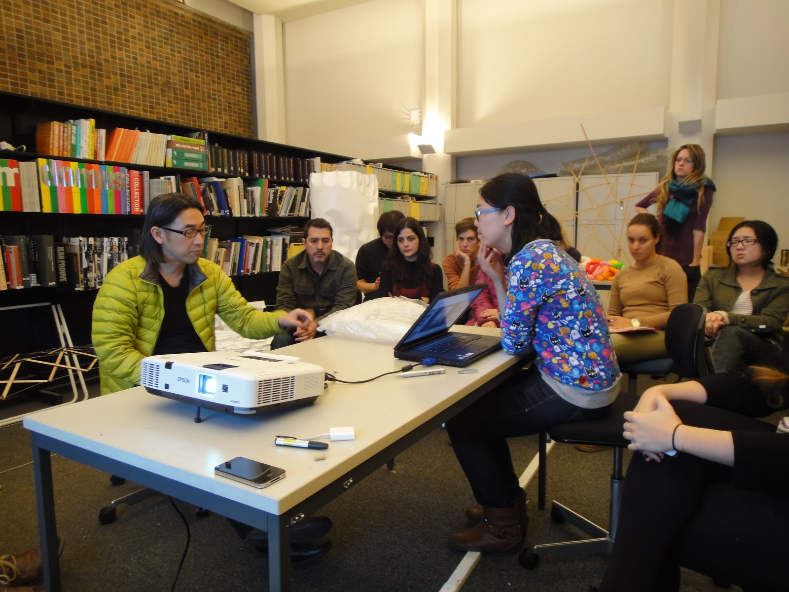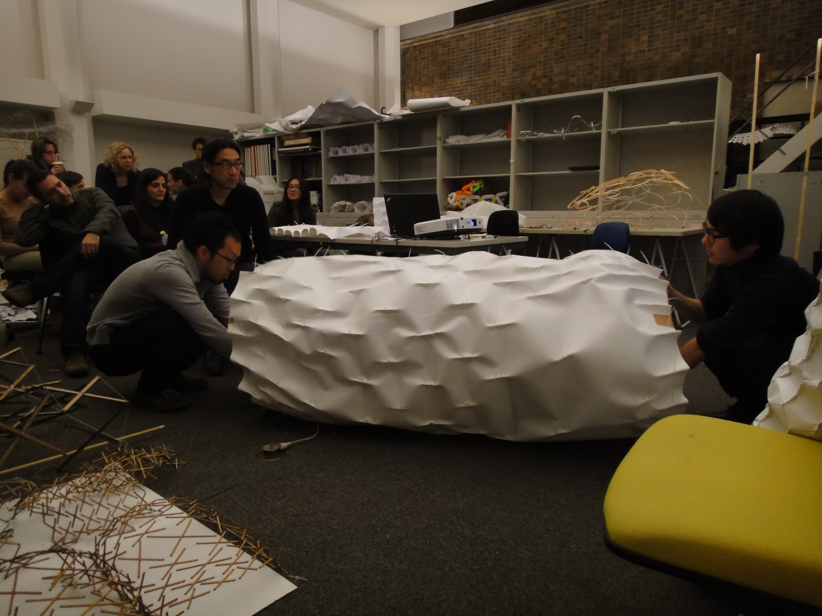 Today, we had midterm review with 1st year students. They have been working on the development of non-liner tensegrity canopy, and the review was focused on design systems, aiming for their work to be developed and built as full-scale pavilions next year. The students will continue developing their work with Rhino+Grasshopper and Processing. Later in the semester, Maya and a structural analysis plugin, developed by Daisuke Hirose who teaches our Maya class, will be used for structural analysis.