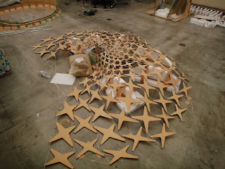 The structural system was developed as a Tensegrity, connecting varying sizes of components with thin stainless cables, creating a network of tension and compression in the form of stable shell structure. When the components are linked as a 2D surface, it remains as flexible. When the 2D surface is positioned in a specific 3D geometry, it locks into a stable Tensegrity structure.