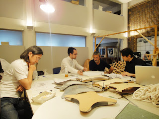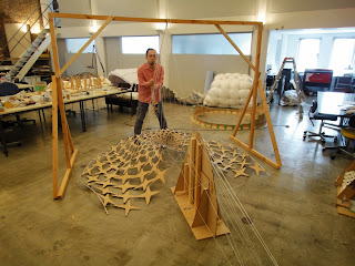 In addition to material research in computational fabrications, we are experimenting with its assembly system. Instead of putting the components on site piece by piece, all of them are linked together to create a 2D surface first and then lifted with a series of cables to form a 3D shell structure. The assembly process is analogous to the way puppets are performed by a hand.