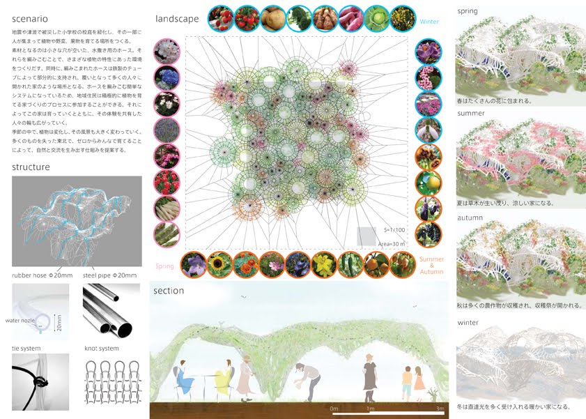 In response to a call for a design proposal for a small community house to be constructed at temporary housing areas in northeastern Japan, we have submitted our design. This event was organized by the 5 established Japanese architects (Toyo Ito, Kengo Kuma, Kazuyou Sejima, Riken Yamamoto, Hiroshi Naito). Instead of designing a building, our idea was to design an environment where the shelters’ residents could come together to grow plants and nurture the spirit of community; as a result, they grow architecture.