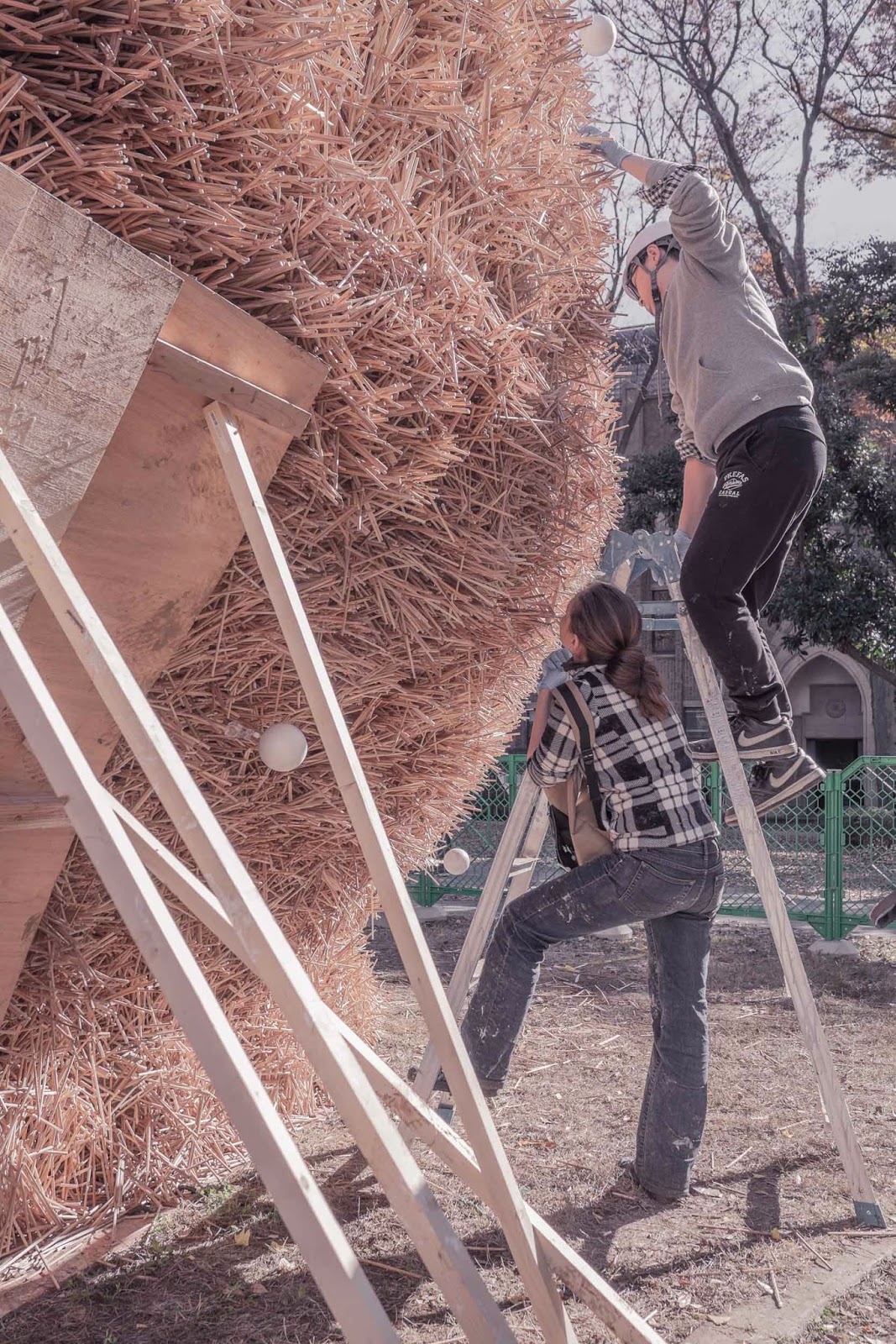 After several tests of small physical models and computational simulations, we tested a mock-up of the pavilion with carbon fiber rods. The pattern is first created in 2D and then pops up to a 3D form when anchor points are released.